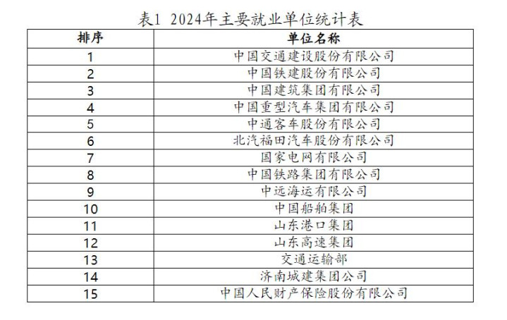 毕业生就业的主要单位包括中国交通建设股份有限公司、中国铁建股份有限公司、中国建筑集团有限公司、中国重型汽车集团有限公司、中通客车股份有限公司、北汽福田汽车股份有限公司、国家电网有限公司、中国铁路集团有限公司、中远海运有限公司、中国船舶集团、山东港口集团、山东高速集团、交通运输部、济南城建集团公司、中国人民财产保险股份有限公司等。