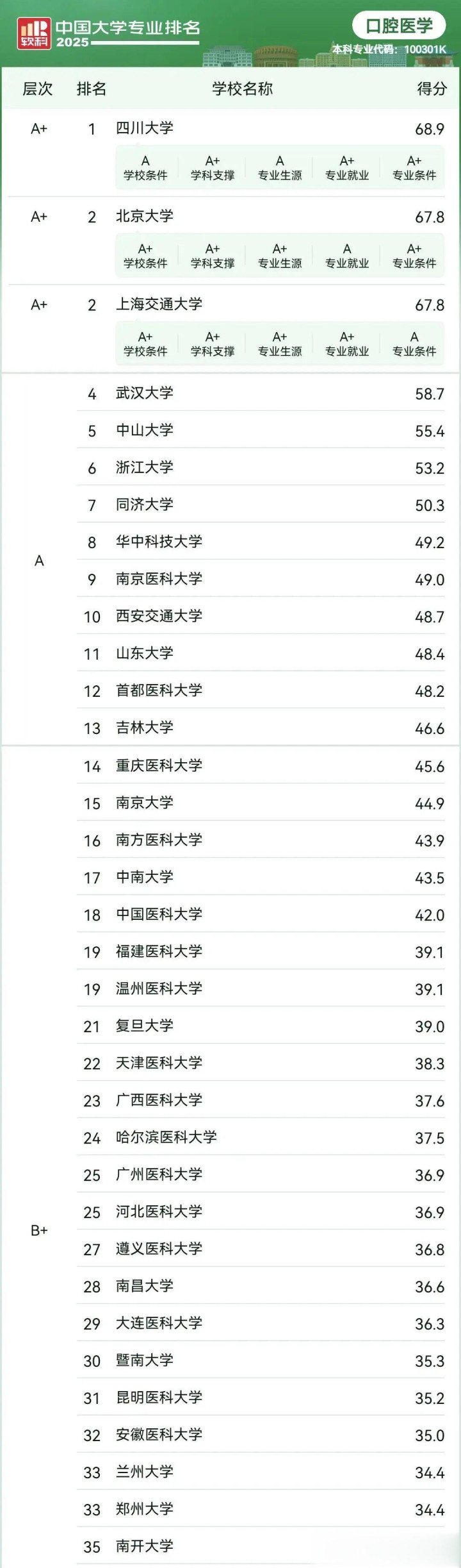 根据软科2025中国大学专业排行榜,口腔医学专业实力分层明显,顶尖梯队基本被985高校垄断。其中综合实力前三甲毫无悬念:四川大学、北京大学、上海交通大学,对应各自的王牌医学部,都是行业内的“金字招牌”。