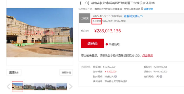 12月2日,京东拍卖平台显示,长沙恒大童世界旅游开发有限公司名下三宗娱乐康体用地及地上在建工程、附着物以2.83亿元成交。